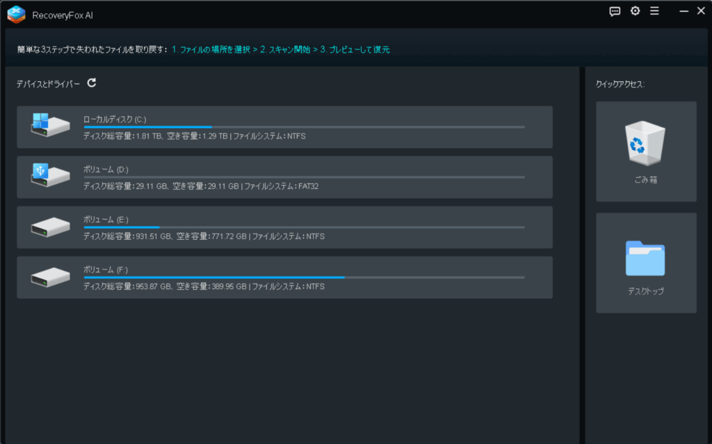 難しい設定や専門用語はなく、スキャン開始→結果表示→復元保存の3ステップで完結。